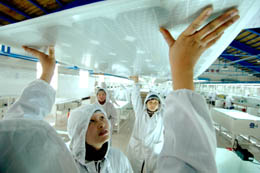 中國用于可再生能源研發(fā)的投資已位居全球前列,在太陽能和風(fēng)能利用方面居于領(lǐng)先位置。圖為浙江省公元太陽能科技有限公司工人正在檢查太陽能光伏電池板。