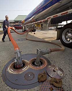 圖為美國弗吉尼亞的一座加油站,一名汽油運輸司機正向加油站輸油。本報資料照片 | 高油價抑制需求效應顯現
