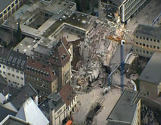 3日在德國科隆市區航拍的建筑物倒塌現場(視頻截圖)。當天,科隆城市歷史檔案館及其鄰近的兩棟建筑物倒塌,造成9人失蹤。新華社/路透