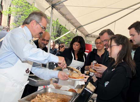 6日,在加拿大首都渥太華的國會山,加拿大農業和糧食部長格里·里茨(左一)向加議員、政府工作人員派送豬肉漢堡,以向民眾展示食用豬肉是安全的。里茨當天強調加拿大的豬肉及豬肉制品是安全的,呼吁公眾增加豬肉消費,以幫助拯救陷入困境的加拿大養豬業。上周,加拿大西部一豬場的豬身上檢測出甲型H1N1流感病毒,一些國家隨即宣布禁止進口加拿大豬肉,加豬肉出口已下跌10%-15%。