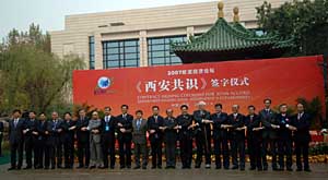 11月9日,代表在《西安共識》簽字儀式上。 當日,為期兩天的2007歐亞經濟論壇在西安落下帷幕,參加此次論壇的政府代表和組織代表達成《西安共識》。 新華社記者