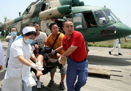 5月18日,醫務人員和志愿者從直升機上接下傷員。當日中午,首批來自重災區北川縣的20名重傷員被某陸航團4架直升機運送到彭山縣,然后轉運至眉山市的主要醫療機構進行救治。北川縣邊遠鄉鎮的重傷員將陸續被送往眉山救治。新華社發(姚永亮攝)