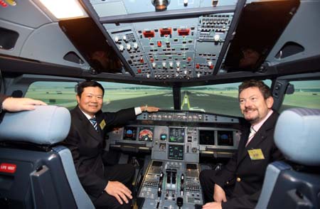 近日,中國民航局購買的首臺空中客車A320全動模擬機在華歐航空培訓中心新樓投入運營。該模擬機可動態模擬飛行實況,將被用來培訓中國民航局的飛行監察員以及各航空公司的飛行員、機械師和乘務員。 圖為在位于北京的華歐航空培訓中心,嘉賓在體驗新投入運營的空中客車A320全動模擬機。新華社記者:侯俊