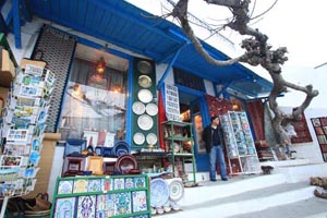 如今小鎮上已很少有先前的居民了,藍白屋子更多地成了一家家店鋪,可即使是琳瑯滿目的店鋪,也沒有什么喧囂,白皮膚、黑皮膚抑或棕色皮膚的店主人,靜靜地坐在門前的陽光下,或者綠蔭里。藍與白似乎將一切喧囂都過濾掉了。