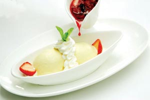 snap,松軟幼滑,口感極佳。 吃的時候,先將DOMUS秘制漿果醬在冰淇淋上涂抹淺淺一層,而后把特配的Brandy