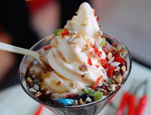 來自美國進口的冷凍花崗巖板可非一般,它是帶給你一款完美冰淇淋的重要環(huán)節(jié)——拌冰臺。零下9℃的冰凍花崗巖石板觸及冰涼,作用于冰淇淋坯和各種配料的混合成形,拌冰工具為同樣冰冰涼的冰鏟。每個店員都有朝氣蓬勃的團隊氣質(zhì),他們還能每隔一會兒唱歌給你聽,隔空拋接冰淇淋球的表演絲毫不亞于雜技演員。每個店員都經(jīng)過專業(yè)培訓,利用雖執(zhí)拗但已經(jīng)被他們操作麻利的拌制手法,讓原本在冰凍柜臺中硬硬的冰淇淋回復蘇醒,隨之加入各種你一見鐘情的配料,一杯綿滑香濃的冰淇淋就這樣誕生了。 拌冰的程序是每個店員都成為冰淇淋專家的重要步驟。選擇口味:巧克力、香草、芝士蛋糕、草莓、芒果雪貝等各種美妙滋味,尤其推薦芒果口味。選擇杯型:推薦中杯(170克)。選擇配料:醬料、各種巧克力豆、彩虹糖粒兒、各種餅干、水果、果仁。最后考慮下你是否需要2元一個的華夫底托,這是酷圣石冰淇淋最美妙的視覺和口感中的另一所在。推薦室外座位和樓上座位,三里屯和雅秀間的風景一目了然。顧客中老外居多,27元/小杯,39元/中杯,50元/大杯。 地址:朝陽區(qū)工體北路三里屯VILLAGES9-19-20號