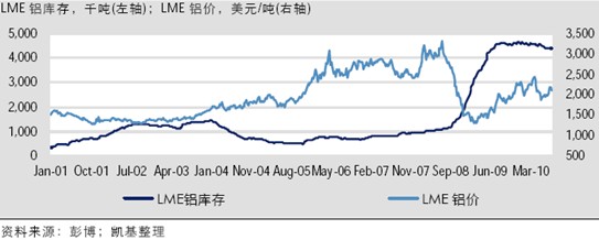2010年預(yù)計將有416.8萬噸新增電解鋁產(chǎn)能投產(chǎn),同比增長40%。國內(nèi)原有電解鋁廠商限產(chǎn)、減產(chǎn),新建產(chǎn)能集中投產(chǎn),2010年下半年國內(nèi)電解鋁庫存壓力會進(jìn)一步增加。 5月份國家發(fā)改委要求取消電解鋁等行業(yè)的優(yōu)惠電價,將限制類企業(yè)電價加價標(biāo)準(zhǔn)由現(xiàn)行每千瓦時0.05元提高到0.10元。目前國內(nèi)噸電解鋁電耗在14,200千瓦時,電價平均上調(diào)0.10