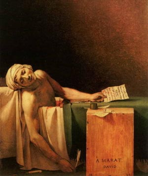 一個名字,已經是那么的著名,甚至在中學生的歷史課上,教師講到法國大革命時,往往都會提到,稱他是一位遭敵人暗殺的革命家和英雄。但也有一些人并不這樣認為,而把他看作是一個嗜血成性的劊子手。大衛和波德里兩位畫家表現他被刺殺的繪畫可以代表這兩種不同的觀點。