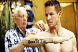 40歲的奧地利人菲利克斯-鮑加特納看上去更像個加利福尼亞州20歲出頭的小伙子,一身潮人打扮:時尚跑鞋、設計師牛仔褲、一件緊身黑T恤恰好露出他前臂上的青色文身——“為飛行而生”。