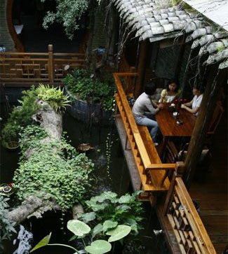 第二次去,下起了大雨,白天的紅燈籠“端莊”了許多。我記得我在熊貓屋中無趣地盤桓,盡可能地在屋檐下避雨,然后拐進一家叫做“繁花似錦”的咖啡館,而從中心位置只能容一人獨立的表演臺來看,這里到了晚上便是酒吧,并奉行酒吧一切幽暗多情的準則。座位擠到仿佛我立馬能揪起鄰座的衣領,東西難吃得讓人懷疑里面的成分,但這兒依然高朋滿座。在這樣的一家店,座椅也非多高檔豪華,但出奇舒服,那種舒服是家里老沙發的那種,靠著臨街的美人靠和雕花木窗。雨還在下,透過兩盆花間的蛛網,一條淺淺的小溪正奮勇騰躍著。