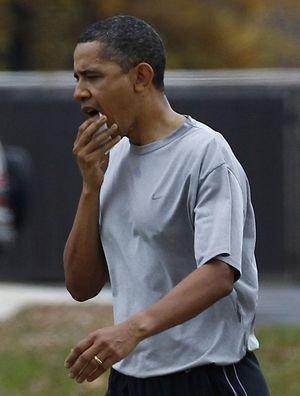 這就是發生在11月26日華盛頓麥克奈爾堡軍事基地的一幕。從圖片上可以看出,奧巴馬身著運動衣,手拿紙巾壓著嘴巴,在數名保鏢簇擁下,走上了停靠在球場邊不遠的總統專車。記者透過車玻璃,拍到了一張奧巴馬坐在車內的照片,奧巴馬看似神情沮喪。