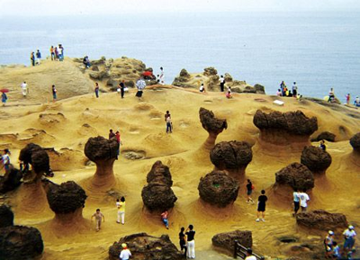 從石門一直往南,最值得看的當然還有野柳。野柳原本只是北海岸上一座小漁村,但因為擁有鬼斧神工般的海蝕地形,這天造地設的奇觀,引人不斷開進深入海面的野柳岬。野柳風景區內最陡峭的山頭便是野柳岬,在岬角的左側為海蝕平臺,平臺上遍布著大小不一的奇巖怪石,你會發現你是穿梭在一整片海蝕平臺之間,似乎天地間就是如此,沒有盡頭。