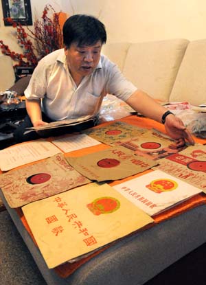 今年50歲的張建洛,是河南省洛陽市的一名普通市民。他從30多年前就開始收藏各種唱片和留聲機。在他收藏的15000多張唱片中,有一套經過精心整理的“國歌唱片檔案”格外惹人注目。據史料記載,《義勇軍進行曲》從1934年誕生,到新中國成立后被定為代國歌、共有16個版本,張建洛收集了所有版本的唱片,包括1934年的電影《風云兒女》插曲《義勇軍進行曲》,1941年美國著名黑人音樂家保羅?羅伯遜演唱的《義勇軍進行曲》,1949年《義勇軍進行曲》作為代國歌在開國大典上演奏的音樂版,1978年經過重新填詞的“新”國歌等,張張堪稱經典。張建洛準備將他的國歌唱片在建黨90周年時,用它收藏的東方紅牌留聲機播放給市民聽,和大家一起分享歷史的回聲。