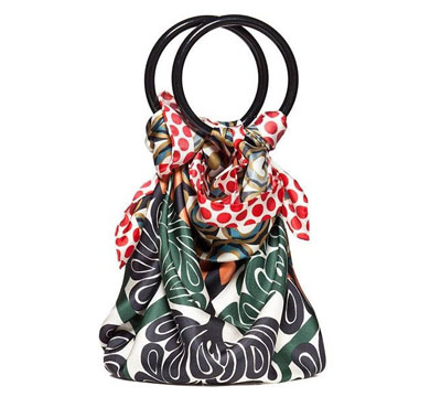 Marni2011秋冬FOULARD系列具有活潑俏皮的圖案、限量版印花,靈感來源于絲巾。MARNI絲巾系列囊括了擁有多彩抽象圖案的服裝及配飾。 趣味混搭:將模塊化的幾何波點,多變的圖案錦緞相結合,展現在絲質的上衣、裙裝、褲裝上。購物袋把手部分由PVC制成,手鐲則由環保復古的LPD制成。