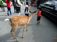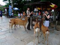 奈良的鹿“懂得”商業規則。鹿餅攤上擺著的鹿餅,雖垂口可食,但絕不伸嘴,就坐臥在旁邊等著游客來遞錢購買。看見有人過來,鹿也站起身,在你后面靜等。游客交了錢,鹿餅包剛拿到手,它們就蹭過來,挨著你的身體跟戀人似的“親密接觸”,也不管你怕不怕、嫌不嫌。反正那意思就是——你不就是為我買的嗎不給我吃給誰?你要是顯得摳門兒,只喂給一小片就把煎餅包要藏進自己的口袋或者高舉起來扭身便走,脾氣不好的鹿可能就會叼住你的衣襟嚇得你呀呀嗷嗷亂叫。而比較紳士淑女的鹿呢,就會拉開半米的距離向你鞠躬,姿態相當優雅。