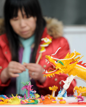 圖為毛紹輝在制作以中國龍為主題的面塑作品。