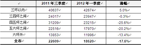 更重要的是,全市房價已經(jīng)出現(xiàn)實質(zhì)性下調(diào),由于過去一年來各項目累計的庫存量較高,部分項目已經(jīng)開始加大折扣幅度,這是房價下調(diào)的基礎(chǔ),各環(huán)線價格普遍下降便是最好的說明:偉業(yè)我愛我家統(tǒng)計數(shù)據(jù)顯示,與2011年三季度相比,2012年一季度三四環(huán)之間均價僅下降0.3%,三環(huán)以內(nèi)房價還上漲5%,為全市價格相對穩(wěn)定的區(qū)域;除此之外,其他區(qū)域房價均出現(xiàn)明顯下降,其中四五環(huán)之間、五六環(huán)之間均價分別下降25.6%、-20.2%,為全市下降幅度最大的區(qū)域。