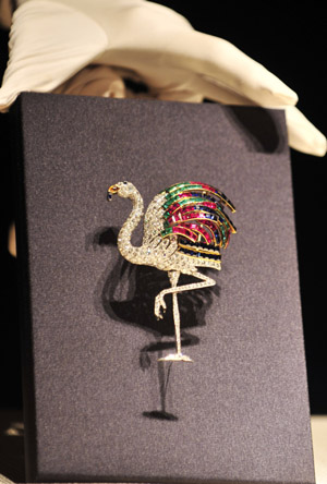 圖為工作人員在臺北故宮博物院圖書文獻大樓開箱展示20世紀英國溫莎公爵夫人佩戴過的“火鶴胸針”。新華社發