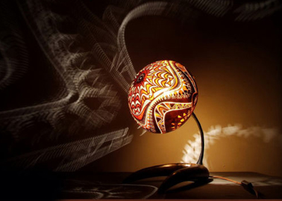 前建筑工程師PrzemekKrawczynski自09年與葫蘆邂逅后邊萌生了利用這種材料制作燈飾產(chǎn)品的想法,并成立了名為CALABARTE的品牌。相比其他的一些燈飾,CALABARTE所推出的產(chǎn)品除了采用生長于塞內(nèi)加爾的葫蘆制作外,每件產(chǎn)品均由他花費兩個多月的時間去完成,設(shè)計師通過純手工制作,在葫蘆上進(jìn)行雕刻、鉆孔、油漆一直打磨,不僅使產(chǎn)品擁有豐富的色彩,還能通過葫蘆內(nèi)部的燈泡將雕刻的花紋散發(fā)出來,打造出別樣的家居環(huán)境。
