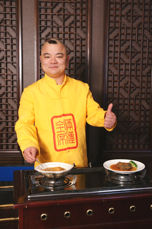 見到胡亮之前,在廣告牌上見過以他頭像制作的logo,已知他“食神”的大名。見面寒暄,胡亮的圓圓的頭上蓄著一撮黃發,大眼睛,彌勒佛似的臉,蕩漾著笑意的酒窩,比logo上更透出廚師的和善與商人的精明。