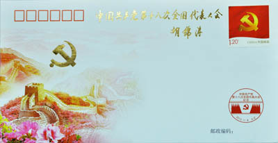 為慶祝中國共產黨第十八次全國代表大會召開,中國郵政于11月8日發行《中國共產黨第十八次全國代表大會》紀念郵票1套2枚、小型張1枚和印有胡錦濤總書記題詞的《中國共產黨第十八次全國代表大會》紀念封一枚。該套郵票圖名分別為“科學發展”和“繼往開來”,面值均為1.20元;小型張圖名為“歡慶”,面值為6元。