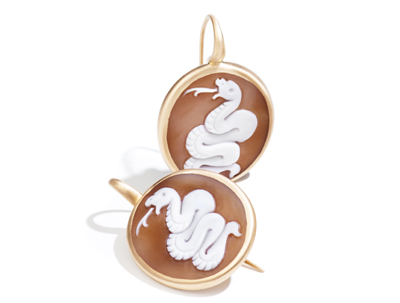 2013年正值中國蛇年,POMELLATO寶曼蘭朵Eva系列運(yùn)用西方藝術(shù)中集繪畫和雕刻之大成的浮雕技法,在寶石上精雕細(xì)琢出中國十二生肖之一——蛇的玲瓏形象,以浮雕珠寶獻(xiàn)禮蛇年。神秘、靈氣、力量兼而有之的珠寶佳作躍動(dòng)指間或蕩漾耳畔,極具新穎獨(dú)到之韻味。寶曼蘭朵的工匠們?cè)谧鹬刎悮ぴ瓲畹幕A(chǔ)上,在這些厚度僅為1至2毫米的原料上發(fā)揮純熟的手藝和才氣,雕刻出活靈活現(xiàn)的蛇。