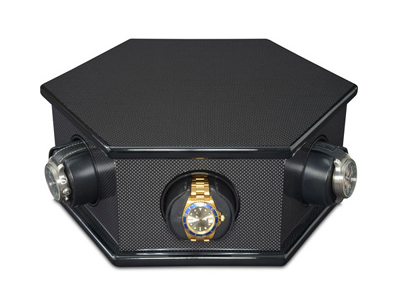 六邊形盒子裝在滾珠軸承上,你可以毫不費力地轉動盒子,方便地裝載和卸下六個位置的腕表。每個電池單獨地與相應的硬碟驅動器相連,有各自的動力與開關。