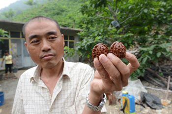 在河北省承德市興隆縣青松嶺鎮螞蟻溝村,一位農民正在展示一對已經把玩了3年的麻核桃。記者 王民/攝 |