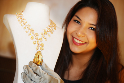 高級珠寶商懋琬為10月11日至15日舉行的新加坡珠寶節(jié)向媒體展示鉆石項鏈,項鏈墜為重達407.48克拉的天然黃鉆“無與倫比”。