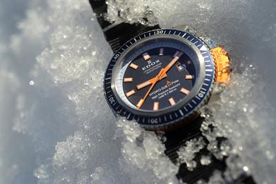 Sub令人驚艷的500米防水來自于在表冠上創新的加入鎖緊防水圈及避震防水圈;而能成為陪伴Redl冰下潛水的重要關鍵是裝置獨特可滑動的表冠保護蓋確保腕表在極度寒冷的環境下仍能順利運作。這只Hydro