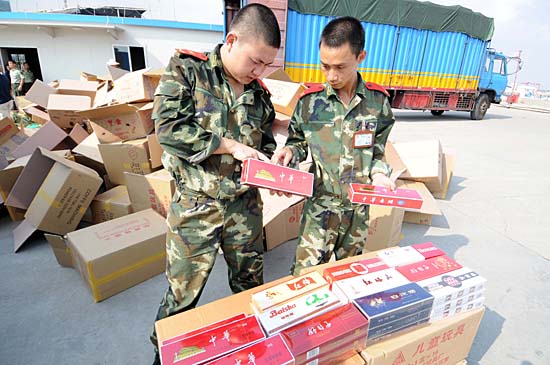 10月21日上午,深圳邊防支隊(duì)鹽田邊防工作站官兵在深圳機(jī)荷高速公路平湖出口處查獲一起涉嫌走私名牌香煙案,當(dāng)場(chǎng)查獲無(wú)合法手續(xù)的中華、紅塔山、紅雙喜等名牌香煙近1000箱,涉案金額約400萬(wàn)元。