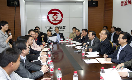 2011年10月,國務院總理溫家寶來到浙江紹興和溫州,深入農村、社區、企業和市場,看望廣大干部群眾,就經濟運行情況進行調研。 圖為溫家寶在紹興縣匯金小額貸款公司考察,詳細詢問小額貸款公司和民間信貸的情況,認真聽取大家的意見和建議。(資料照片) |