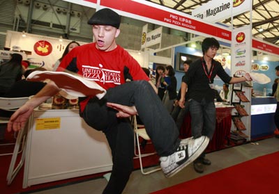 12月4日,2008中國(guó)國(guó)際食品及酒店設(shè)備用品博覽會(huì)在上海新國(guó)際博覽中心開幕,來(lái)自美國(guó)、英國(guó)、日本、新加坡等25個(gè)國(guó)家和地區(qū)的近750家食品企業(yè)參展。本屆展會(huì)的展出面積達(dá)8000平方米,展出了各國(guó)風(fēng)味的食品、飲料,參觀者在大飽眼福的同時(shí)也能免費(fèi)品嘗各種美味。圖為一名廚師正在展會(huì)現(xiàn)場(chǎng)制作比薩。 |