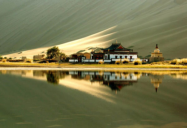 位于巴丹吉林沙漠深處的廟海子,又名蘇敏吉林海子,是沙漠腹地最美麗的景點之一,吸引眾多國內外攝影師前來采風。 廟海子被3座大沙山包圍,湖邊還有大片的平地,盡管只住著3戶人家,但巴丹吉林嘎查(村委會)的駐地就在這里。 廟海子因湖畔有一座藏傳佛教寺廟而得名,寺廟院落不大,剛剛修葺過,正殿墻面白、紅、黃色相間,彩瓦飛檐,雕梁畫棟,墻壁上繪滿了佛教壁畫,藏經閣里擺放著很多布裹的經書,廟里燃著酥油燈和香,莊嚴肅穆。 巴丹吉林廟建有一人多高的圍墻,臨近湖邊矗立著一座白塔。廟后緊挨一座高大的沙峰,旁邊生長著高大的白楊和柳樹。 臨近黃昏,夕陽灑在沙山和湖面上,水面映出寺廟、沙山和樹木的倒影,海子邊居民喂養的山羊和鴨子隨意而悠閑。 據記者了解,廟海子旁的寺廟名為巴丹吉林廟,建于1775年,正殿建筑分上下兩層,面積近300平方米。 年輕的喇嘛哈斯烏力吉說,相傳建設寺廟時,一磚一瓦、一石一木都是靠人力背運及牦牛和羊群馱運,費盡了艱辛。 還有一件神奇之事,廟海子邊上有幾眼“靈泉”,叫“聽經泉”。其中岸邊的一眼泉水出水處大若碗口,廟海子里還有更大的泉眼,噴涌而出的水花比兩三個臉盆還要大。 海子邊的居民告訴記者,當旁人高聲呼喊或使勁跺腳時,廟海子的泉眼會更猛烈地噴涌,聲音過后又會恢復原樣,頗為神奇。 一些居民說,昔日廟內喇嘛眾多,每當喇嘛高聲誦經,海子里的泉水就會泛起成片成片的水花,“聽經泉”由此得名。 |