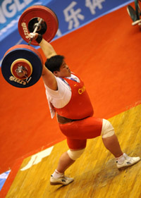 4月18日,吉林隊選手穆爽爽在2008全國女子舉重錦標賽暨奧運選拔賽75公斤以上級比賽中,以145公斤、183公斤和328公斤的成績分別獲得抓舉、挺舉和總成績冠軍,并超該級別三項世界紀錄。 新華社記者:陳曄華 攝