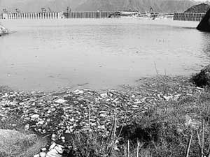 圖為湖北宜昌三峽大壩上游壩前庫區水面上漂浮的垃圾。劉君鳳
