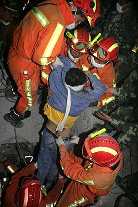 下午我們偶然發現縣委大樓底下還有生者,就集中力量救援,我們的生命探測儀發揮了重要作用,很快就確定了被救者的位置。幸存者是這個縣的政法委書記,由于他長期在黑暗中見不到亮光,我們就一直用毛巾捂著他的眼睛,而他執意要拿開我們放在他臉上的手巾,說要看我們一眼。我們告訴他,你不能看,見到光后你可能失明。他說,就是失明也要看看是誰救了我,我們堅決不讓。他的眼睛保住了。我們真的很開心。 晚上回來的時候,吃上了方便面和大米粥,而且今天清水也送來了。大家4天來終于可以洗一次臉了。